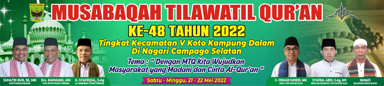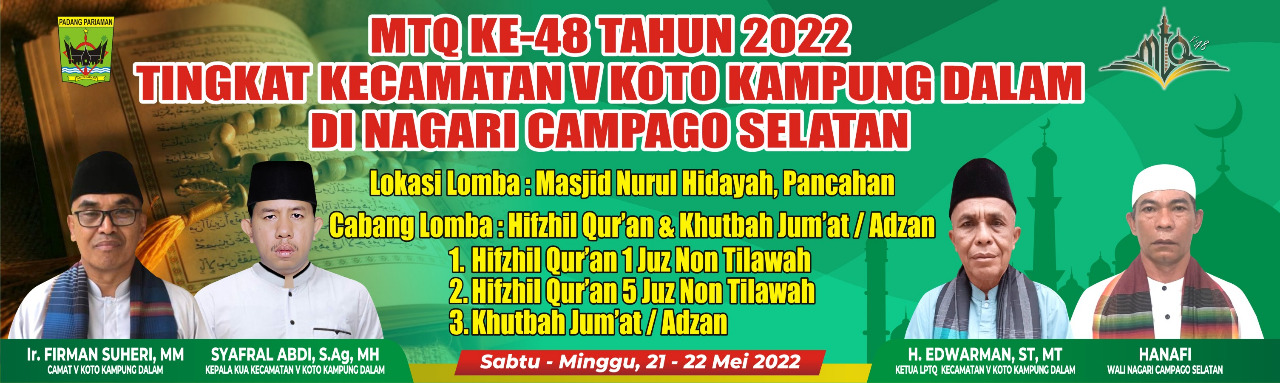 Jum'at. 13 Mei 2022. Musabaqoh Tilawatil Qur'an (MTQ) ke 48 tingkat Kecamatan V Koto Kampung Dalam di Nagari Campago Selatan akan di ikuti Delapan (8) Nagari yang ada di kecamatan V Koto Kampung Dalam yang akan berlangsung pada tanggal 21 dan 22 Mei 2022 dengan tema mewujudkan masyarakat yang madani dan cinta al-qur'an. Adapun cabang lomba antara lain :